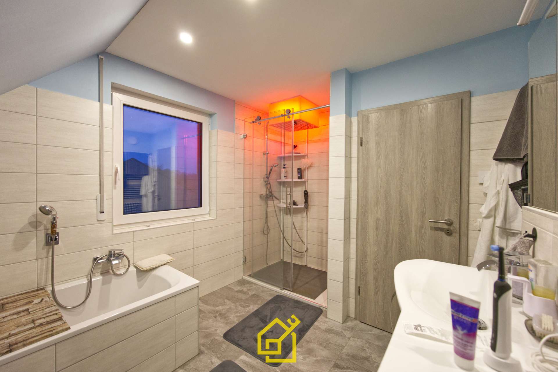 - Bad: Regendusche mit Farbwahl + Radio, Badewanne, Handtuchheizkörper, Waschbecken, WC